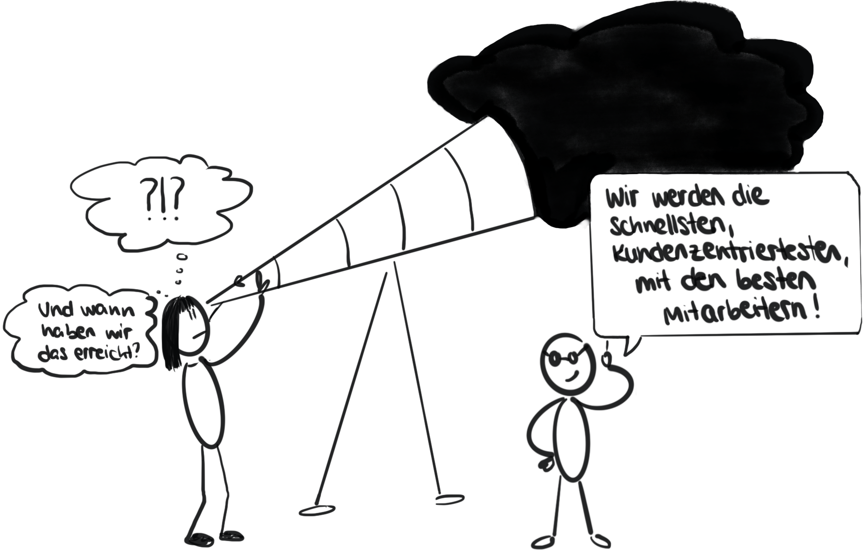 Gute Visionen klingen, wenn sie das erste Mal ausgesprochen werden, unmöglich, verrückt und unrealistisch. Sie sind ein ausgesprochener Zukunftsentwurf. Ziele werden für alle verständlicher, wenn man das „Warum?“ erklärt. Vom Know-how zum Know-why. Was bedeutet es, besser zu werden? Warum wollen wir den Umsatz erhöhen?