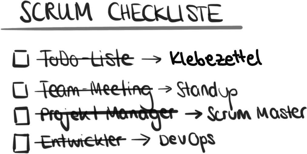 Benutze bunte Klebezettel am Fenster und mache Meetings im Stehen. Fertig ist Scrum. Alles andere kann so bleiben. Falls jemand eine präzisere Umsetzung der Methode fordert, benenne Meetings und Rollen um. Zum Beispiel Projekt Manager heißen jetzt Scrum Master, Entwickler sind jetzt DevOps oder das wöchentliche Reporting heißt nun Standup.